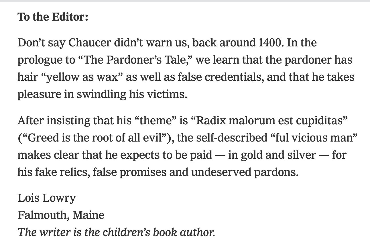 I lay there wondering if I were on a Trumpian enemies list somewhere. What had I done? Well, a while back…his first term, the end days… I wrote a letter to the NYT after he pardoned a lot of people including the 1/6 insurrectionsts. That letter is still in my computer, and still in the archives of the NYT, where it was published: